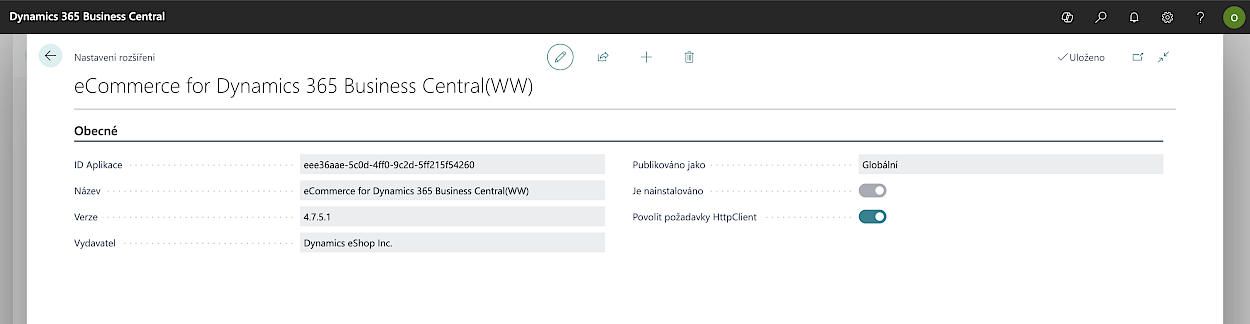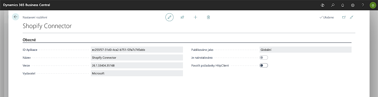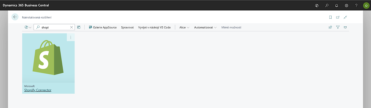 Ukázka správy rozšíření Shopify Connector v Microsoft Dynamics 365 Business Central