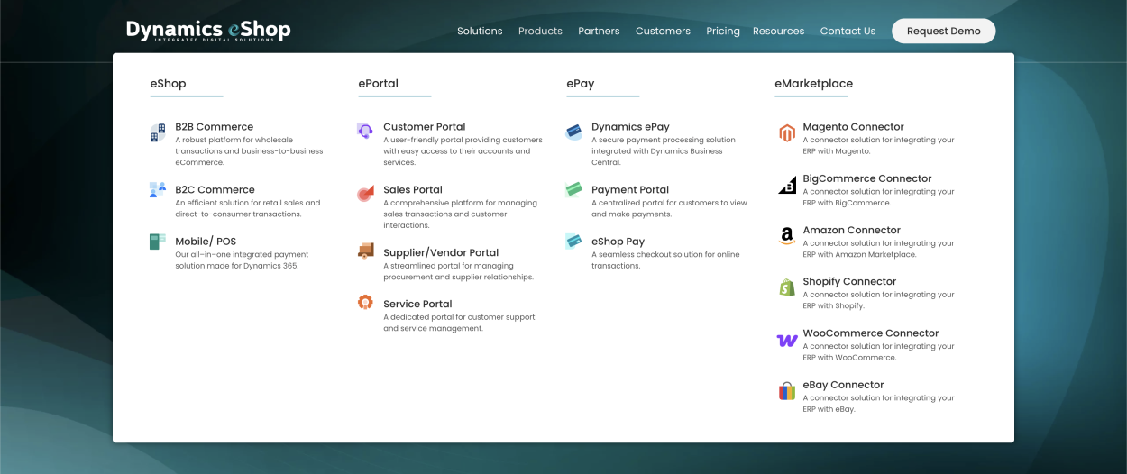 Produkt se skládá ze dvou částí, a to jednak modulu v systému Microsoft Dynamics 365 Business Central, druhou částí je pak samotný eShop, který komunikuje se systémem Business Central právě prostřednictvím instalovaného modulu. Jedná se o produkt třetí strany, který je nabízen formou implementace s přizpůsobením webu dle vlastních požadavků. Na výběr máte vzhled z mnoha šablon, nebo vám může společnost Dynamics eShop Inc. vytvořit vlastní šablonu vzhledu dle vašich požadavků na vzhled a odlišení.