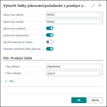Stejné možnosti jsou pro dozásobení prodejní objednávky, kde můžete také generovat požadavky nákupní i výrobní.